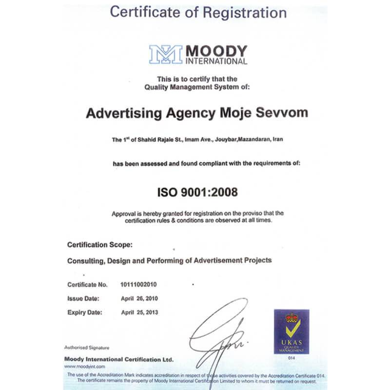 ما با بهـره گیری از توانمندترین و خلاق ترین ایده پردازهای تبلیغـــاتی درصدد ارتقاء سطح کیفی فعـــالیتهــای خود بوده و همواره سعی نمودیم رضایت مشتریــان خــود را به بهتریــن نحو بر آورده سازیم. در این راستا با انتخاب الگوی سیستــــم مـــــدیریت کـــــیفیت ISO 9001:2008 سیـــاست کیفیتی را بــرای اطمینـان از مـوارد زیر اتخـاذ نــموده ایم که به شرح ذیــل می بــاشد: